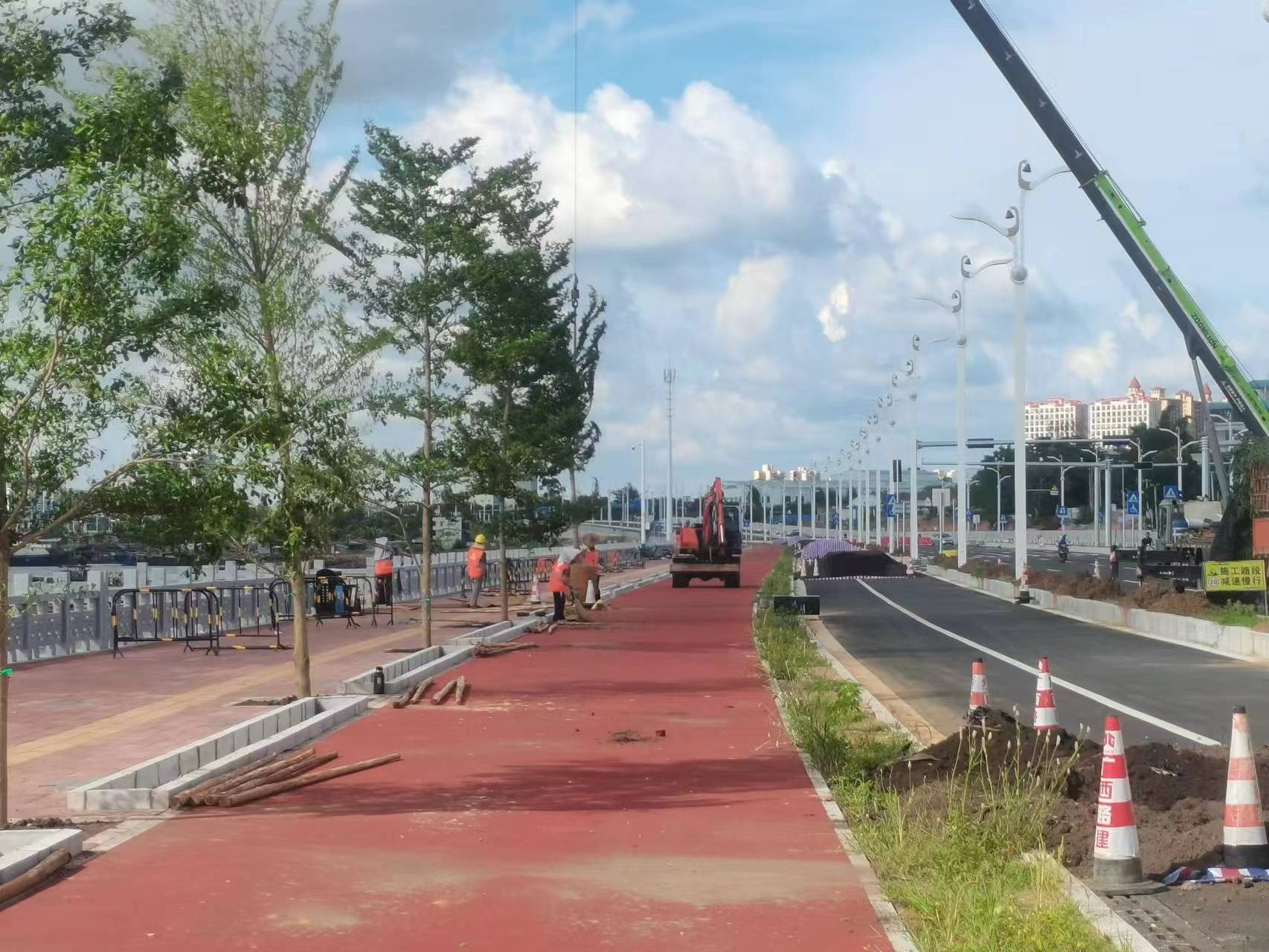 炎炎夏日草木长,道路绿化施工忙。廉州湾大道(209国道路口至向海大道路口段)绿化工程施工现场一派繁忙景象,园林工人正在加紧栽植绿化苗木。