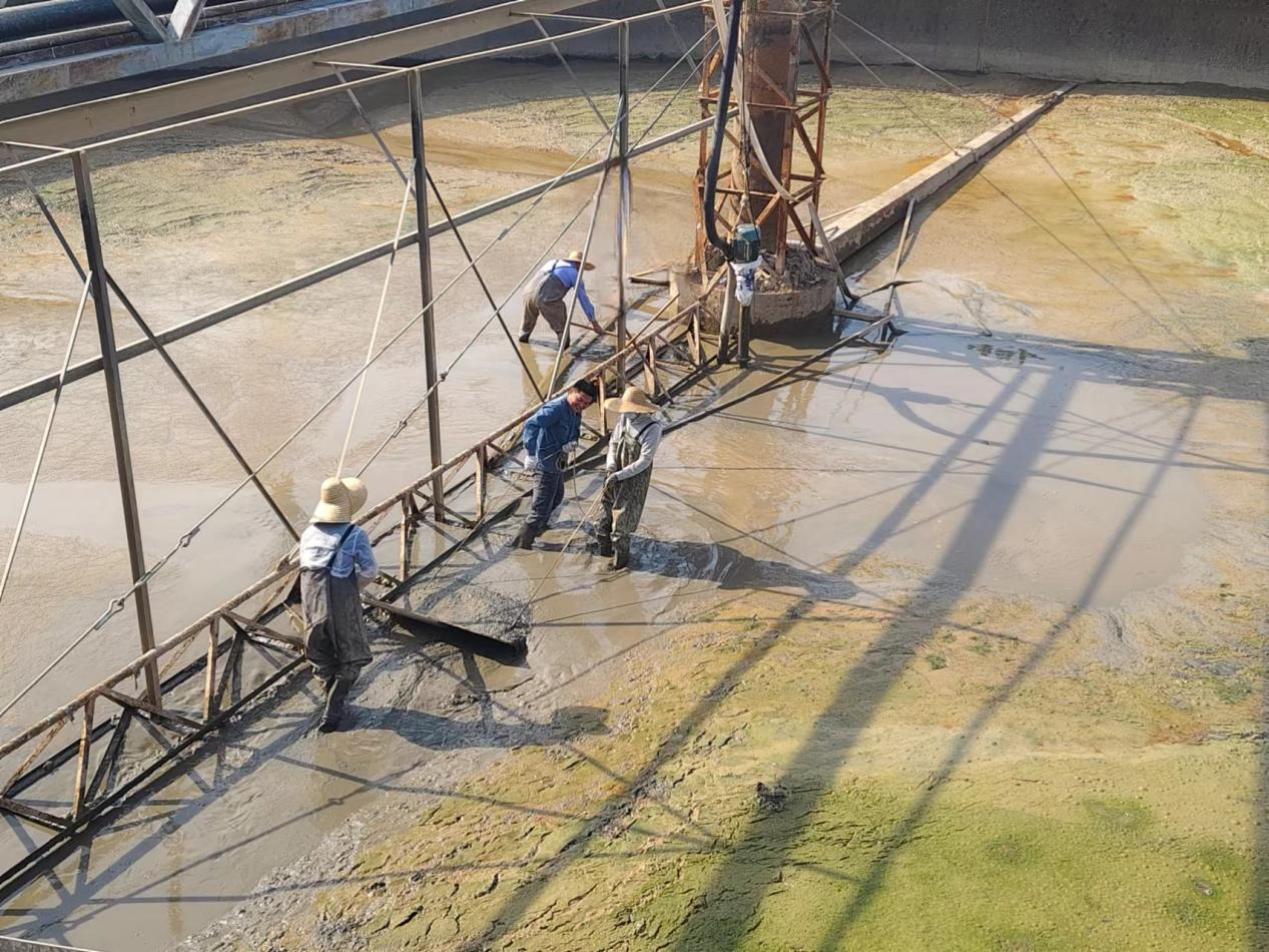 人工将二沉池四周堆积的淤泥聚拢在中间