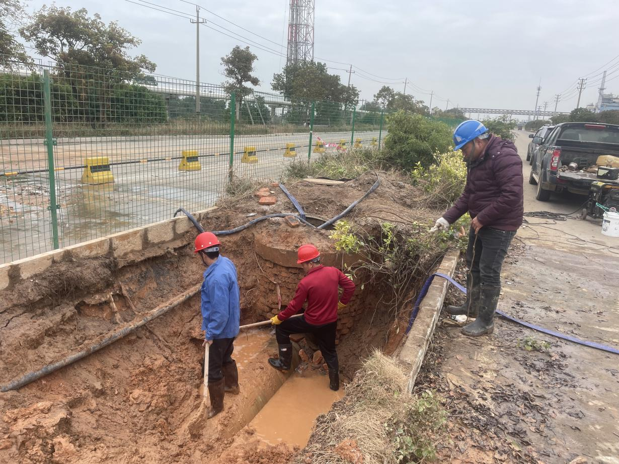 抢修过程并非一帆风顺,遇到了诸多困难。地下水位较高,排海管道不断有水涌出,抢修人员不得不一边排水,一边进行抢修,大大增加了工作难度和工作量。此外,狭小的作业空间让抢修人员操作困难,加上天气寒冷,导致身体极易疲惫,但他们依然咬牙坚持。由于时间紧迫,抢修人员深扎抢修一线,饿了现场对付几口,累了就地休息,从早上7点开始,连续奋战16个小时,到了晚上23点终于修复完成,中石化恢复正常排水。
