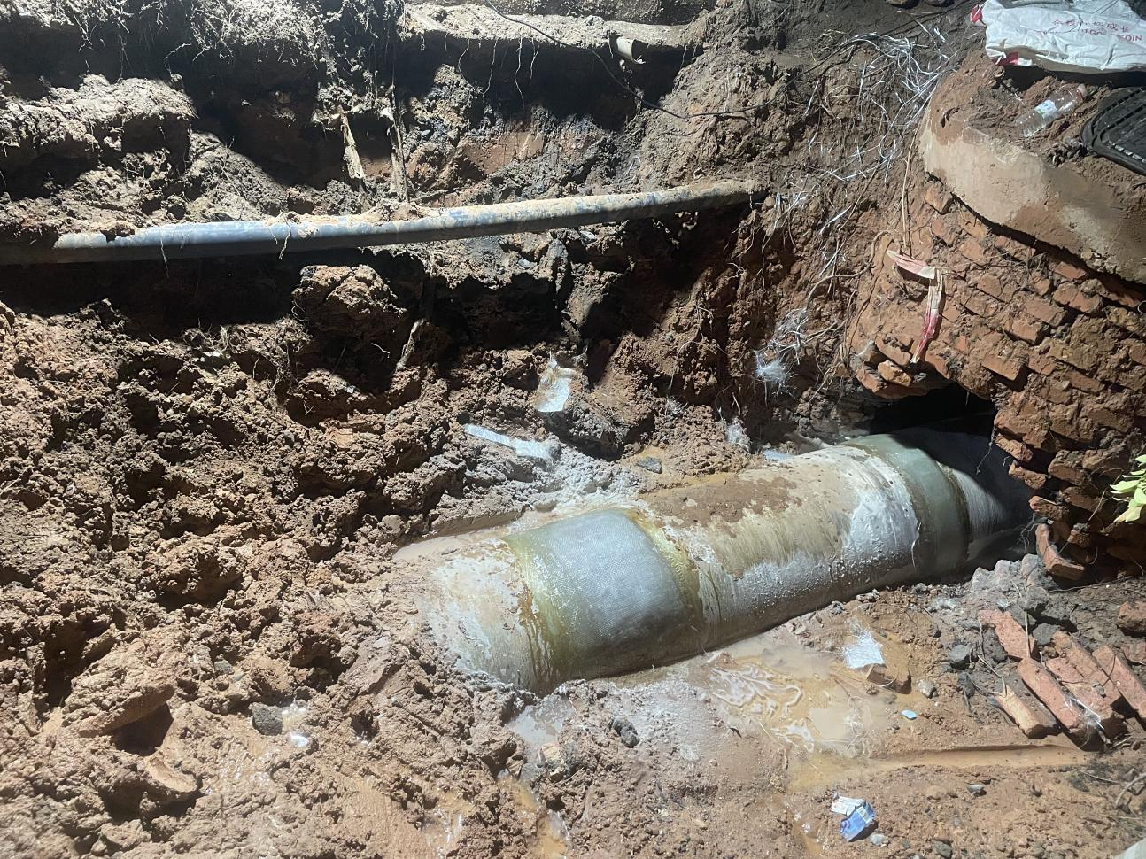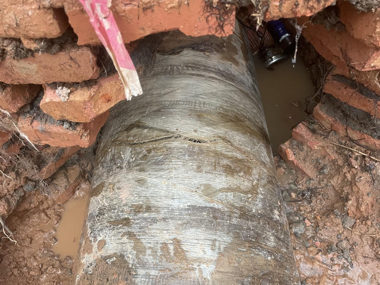 抢修人员对现场进行研判,立即组织人员开挖。经现场勘查,排海管漏水位置极为隐蔽,处于检查井壁下方,维修空间狭小,稍有不慎就有可能发生次生问题,给抢修工作带来了重重障碍。