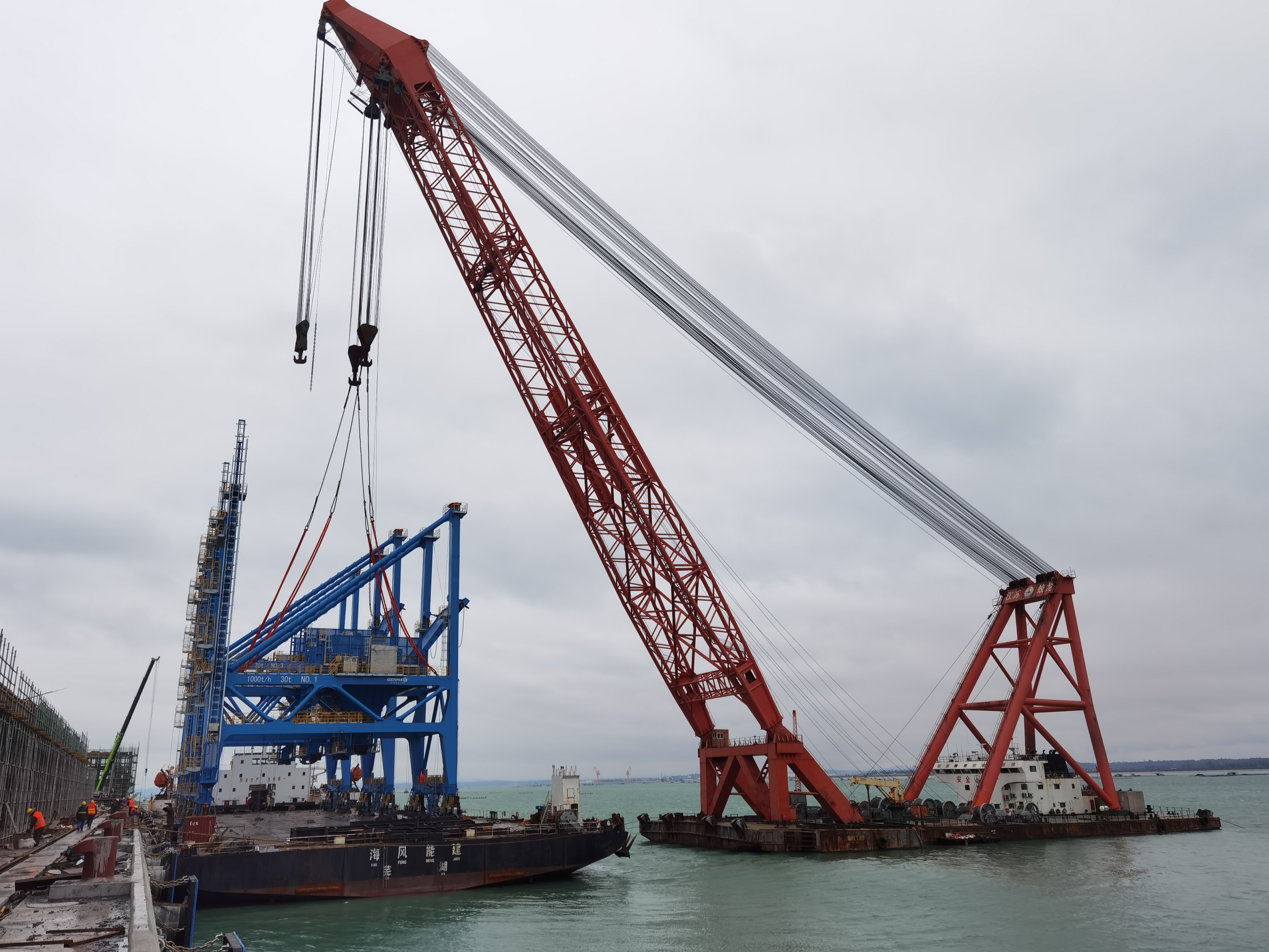 3月1日上午,北海港铁山港西港区石头埠作业区8号9号泊位主体工程完成后,桥式抓斗卸船机设备开始安装,4台桥式抓斗卸船机将分为上下两部分结构通过1100吨起重船吊装上泊位进行安装。