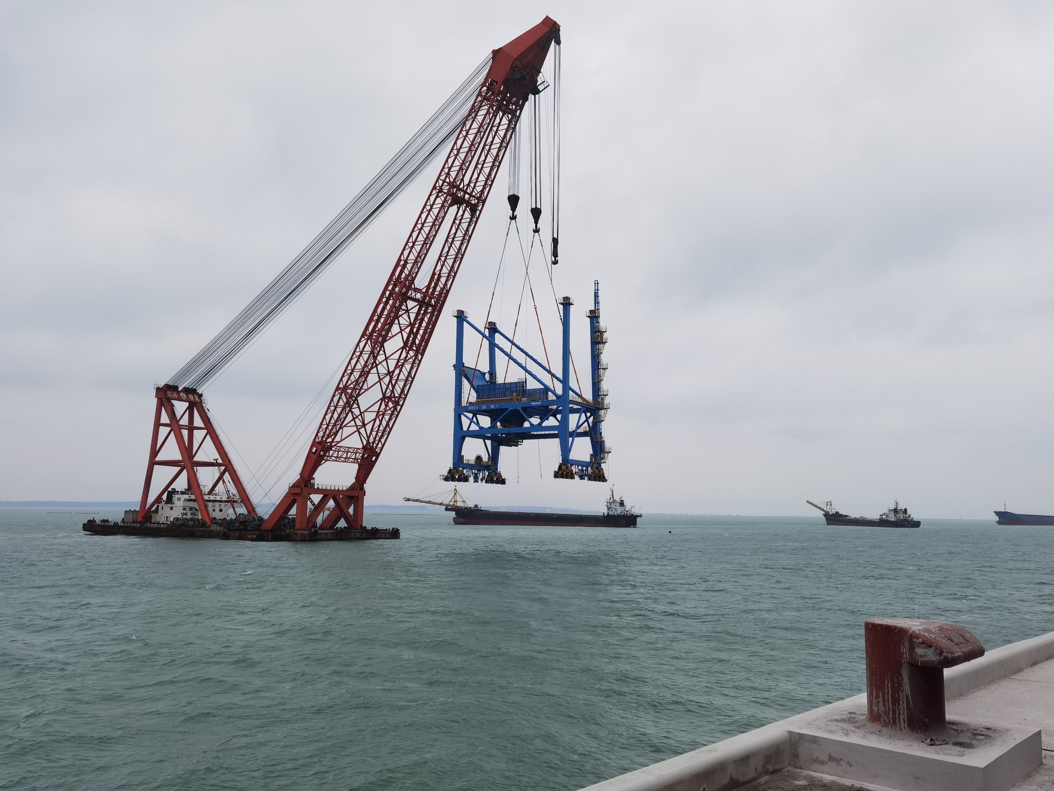 8号9号泊位工程本次配套设备共有5台(4台桥式抓斗卸船机、1台带斗门座起重机),抓斗卸船单机重量约1000吨,作业效率为煤炭1000吨/小时;木片2000m³/小时;带斗门座起重机单机重量约754.9吨,起重量为吊钩:50t/25m;45t/37m;抓斗40t/37m。配套设施分两批次进场,第一批4台桥式抓斗卸船机设备于2月28日起陆续抵达码头,第二批1台带斗门座起重机预计4月30日抵达码头。